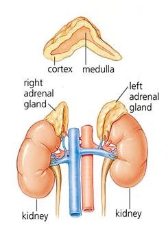 The adrenal glands are small, triangular-shaped organs that are located above each kidney. They are endocrine organs, producing essential hormones that are involved in many bodily functions including blood pressure, fluid and electrolyte maintenance, glucose control, and the adrenaline reaction during stress. The hormones produced include cortisol, aldosterone, epinephrine, norepinephrine, and some of the body’s sex hormones. Only one adrenal gland is needed to provide the body’s necessary hormones.